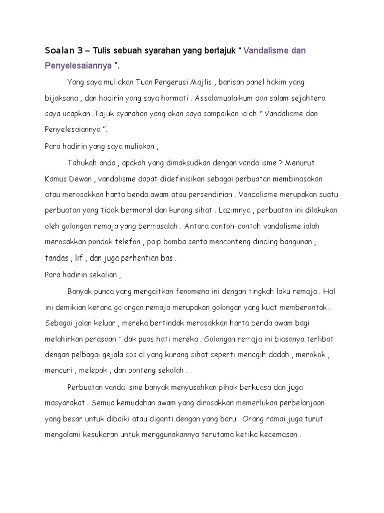 Yang Arif lagi bijaksana panel penilai dan rakan-rakan yang dihormati. Karangan Jenis Syarahan Soalan. Contoh karangan syarahan pt3 bahasa melayu.